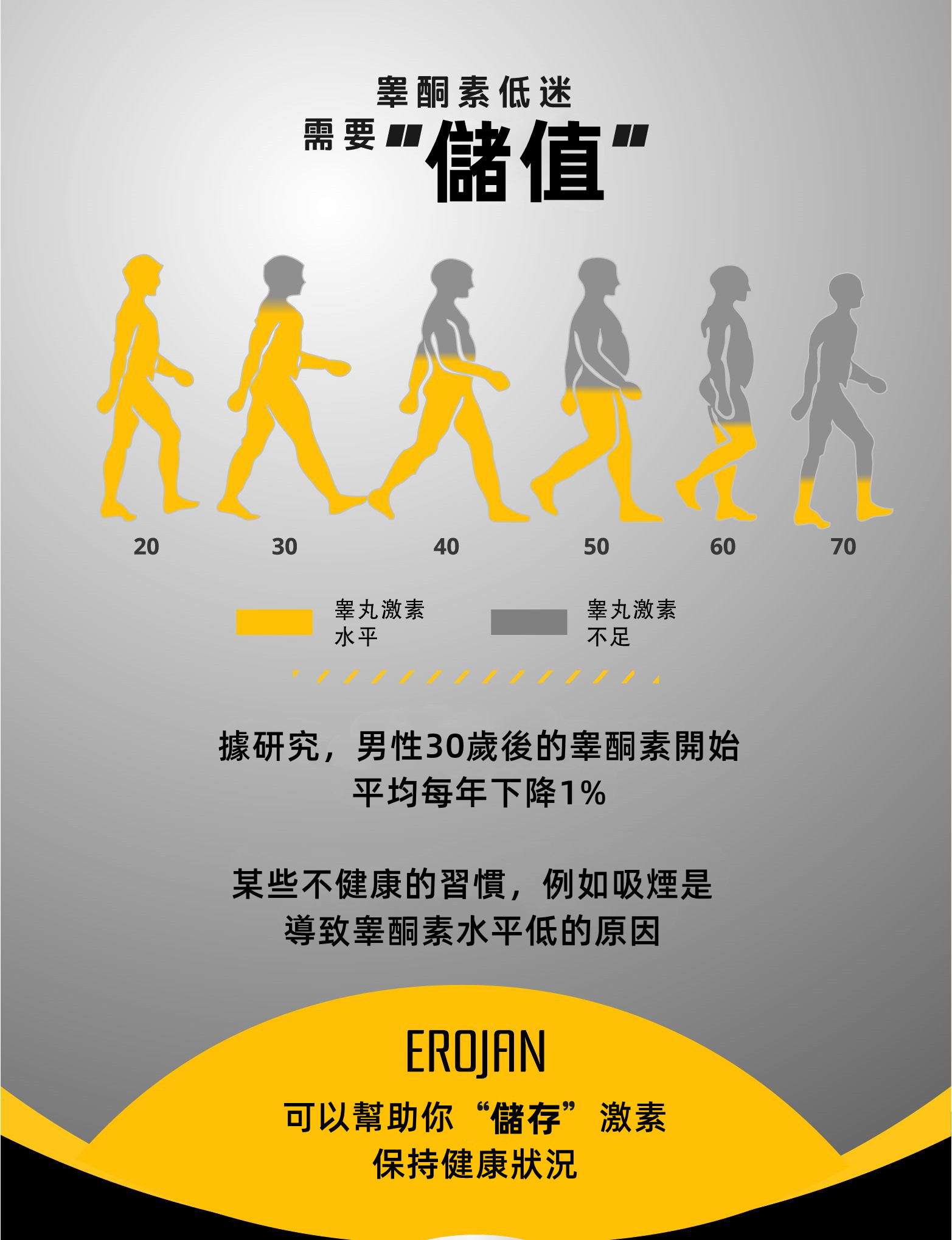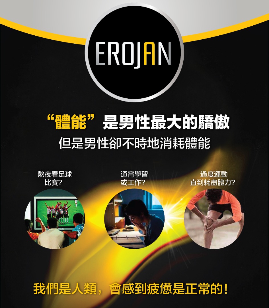 EROJAN是針對男性增加睾酮素水平而研製的保健品,讓你可以釋放潛在的健康活力維持最佳體力.EROJAN除了可以提高和增加身體活力也可以加強骨骼密度,支援整體男性氣概。 EROIAN 可以幫助調節睾酮索水平和脂肪分佈好讓你可以輕鬆跟上日常生活的步伐。 EROIAN 主要6種成分是東革阿里,蒺藜,淫羊蕾,瑪卡,紅野葛根和菟絲。