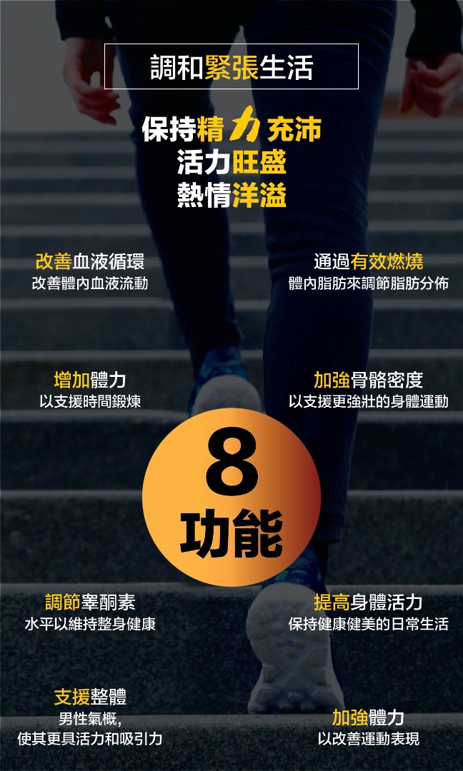 -瑪卡(Lepidium meyenii)可提高精液質量和提昇運動表現。-紅野葛根(Butea superba)有助於增加骨骼強度和密度。-菟絲(Cuscuta chinensis)有助於減少肝毒性和減少氧化應激。