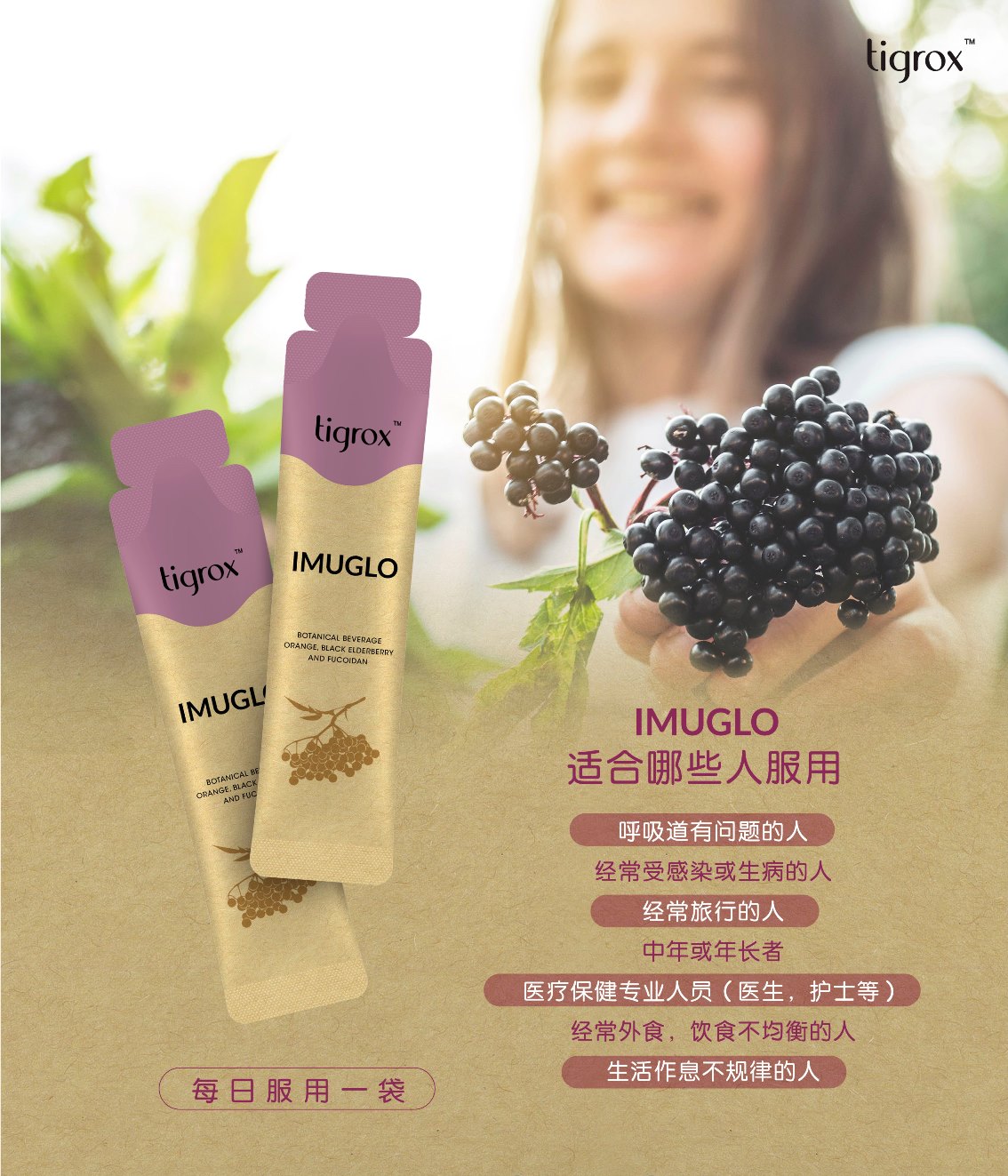 IMUGLO是由集合两大跨世纪成分黑接骨木莓和褐藻糖胶所组成的, 它能由内而外增强身体的防护屏障,和增强免疫系统。 免疫系统是帮助人体抵抗病毒, 细菌和寄生虫等的防御系统。 IMUGLO 适合免疫系统较弱/ 经常受感染或生病/ 呼吸道有问题/ 年长者/ 饮食不均衡/ 生活作息不规律者服用。