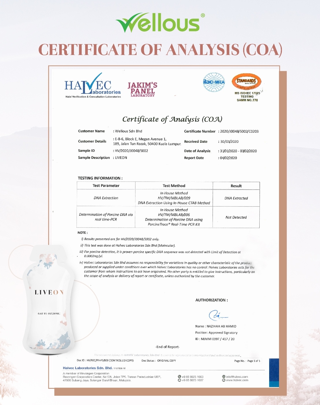 In order to ensure that our LIVEON can be sold safely, LIVEON has undergone strict quality inspection in the laboratory, and KKM and NPRA are classified as food product. The above are the lab reports, LIVEON is free of Microbes and heavy metals, and also does not contain any gluten allergens.