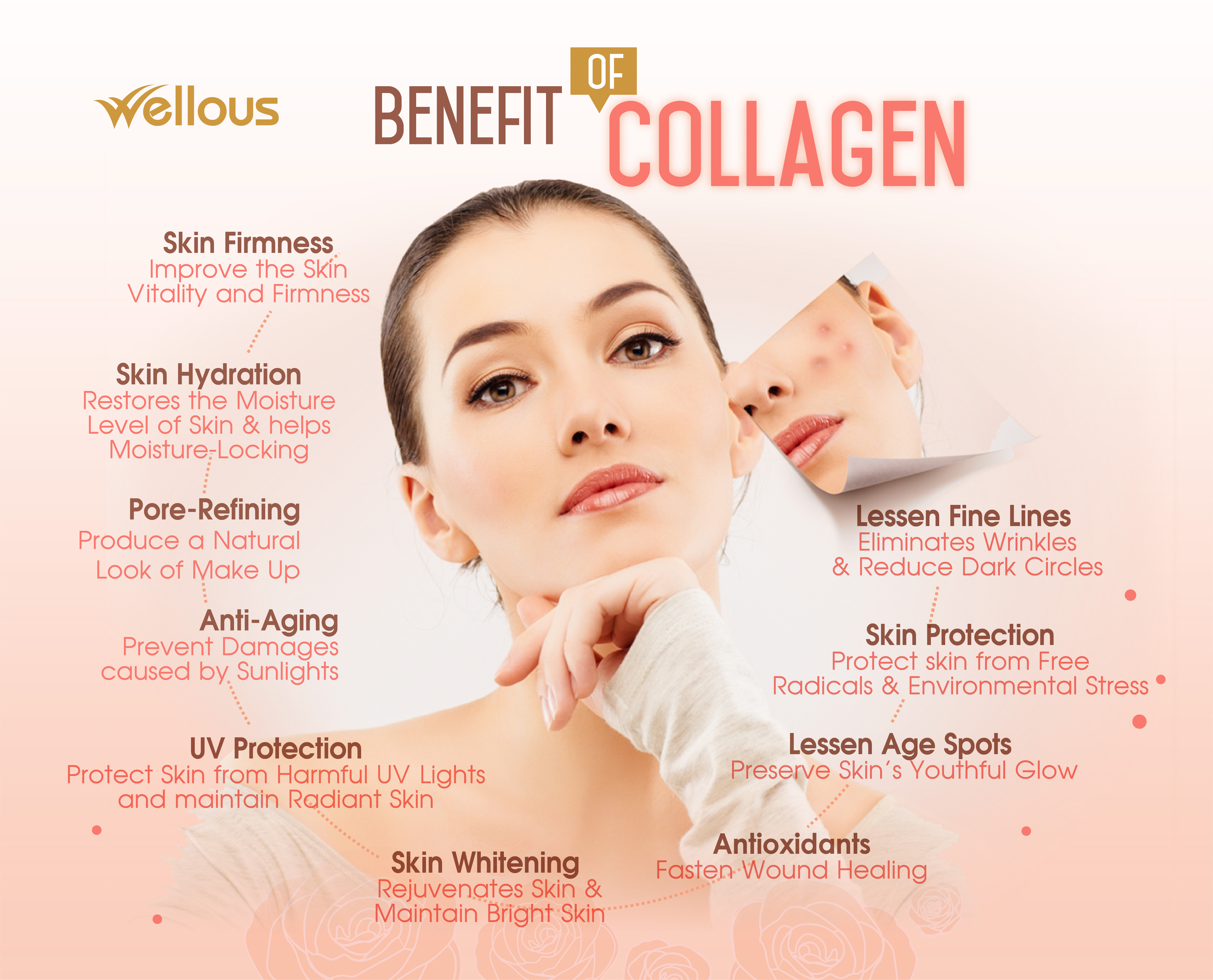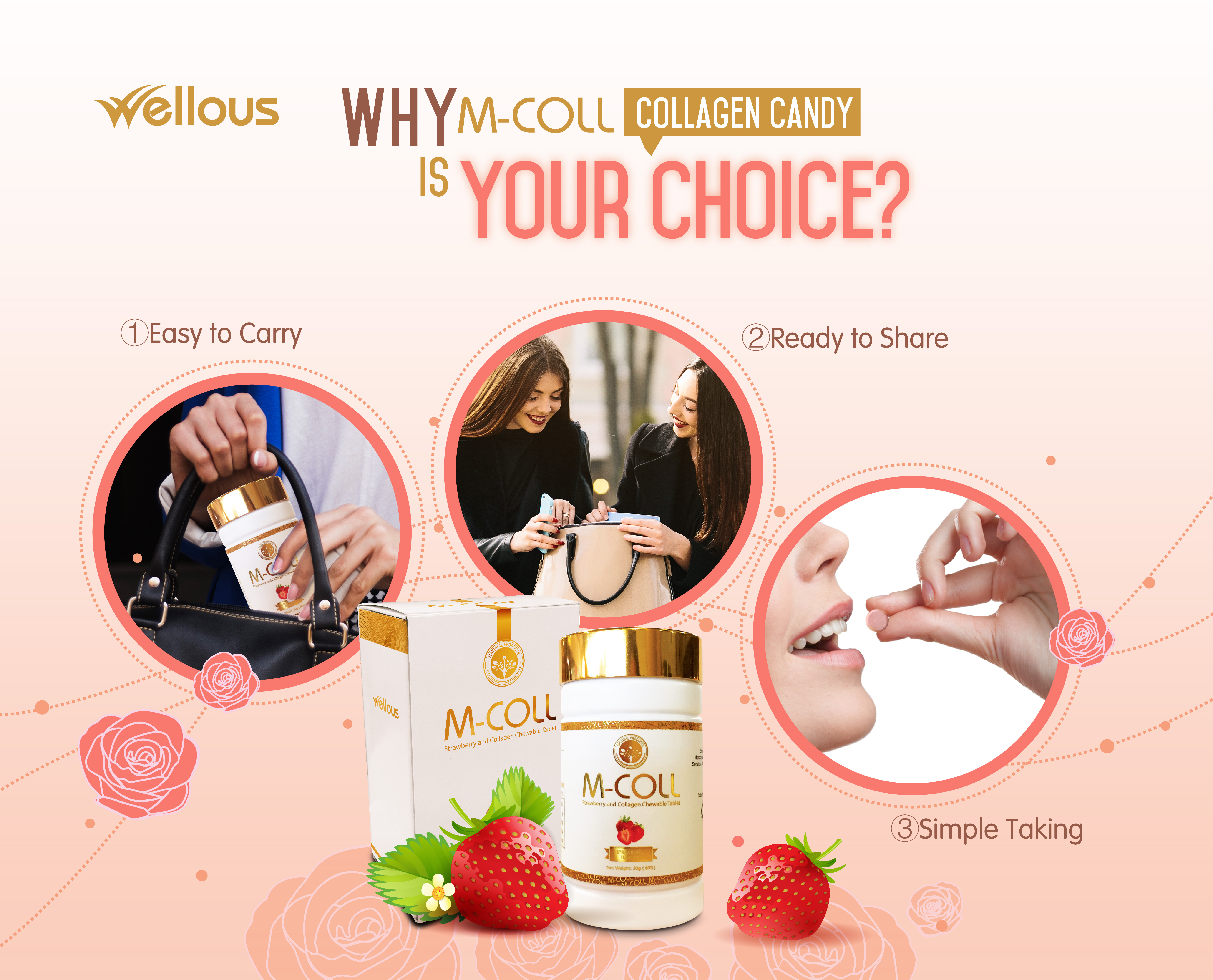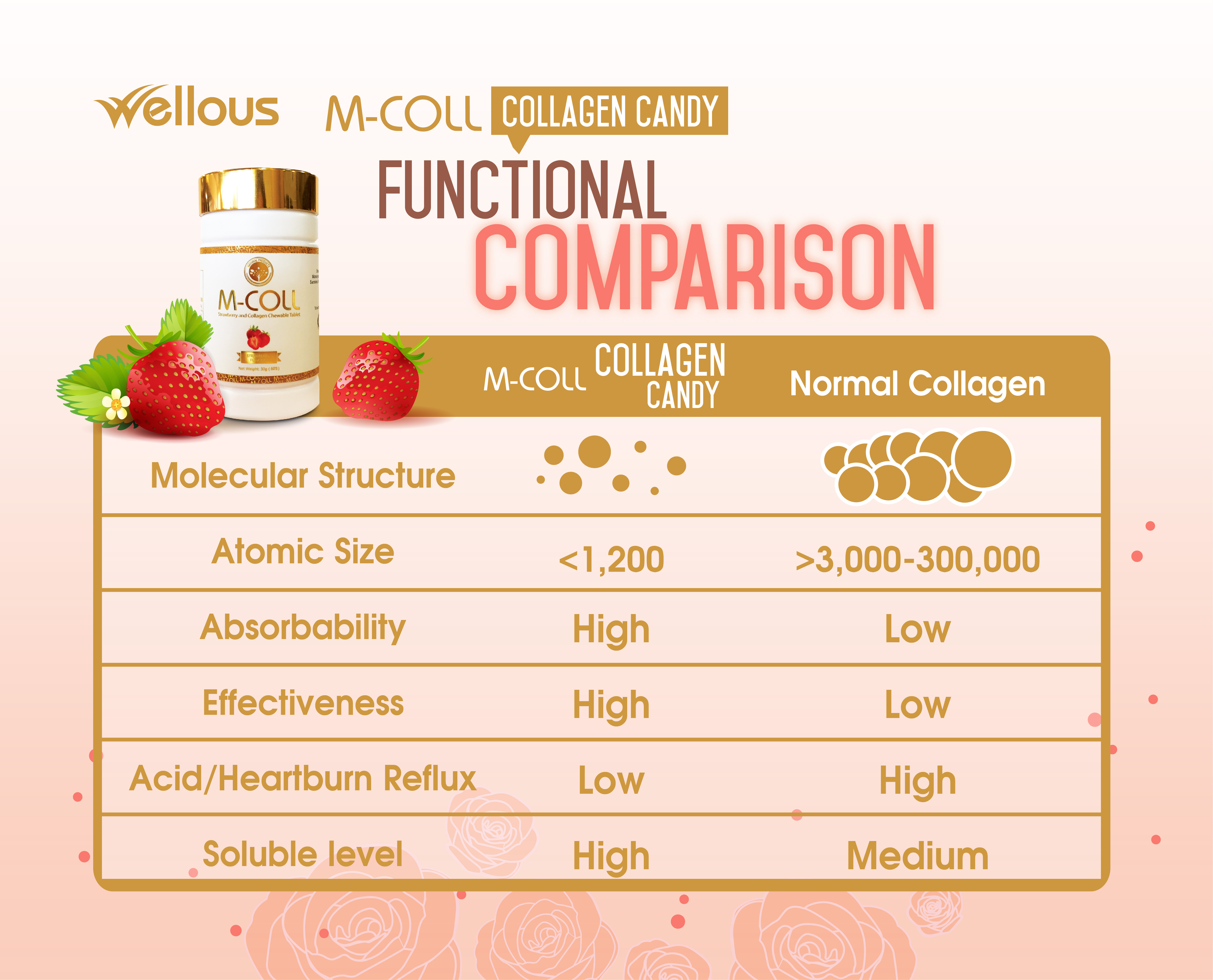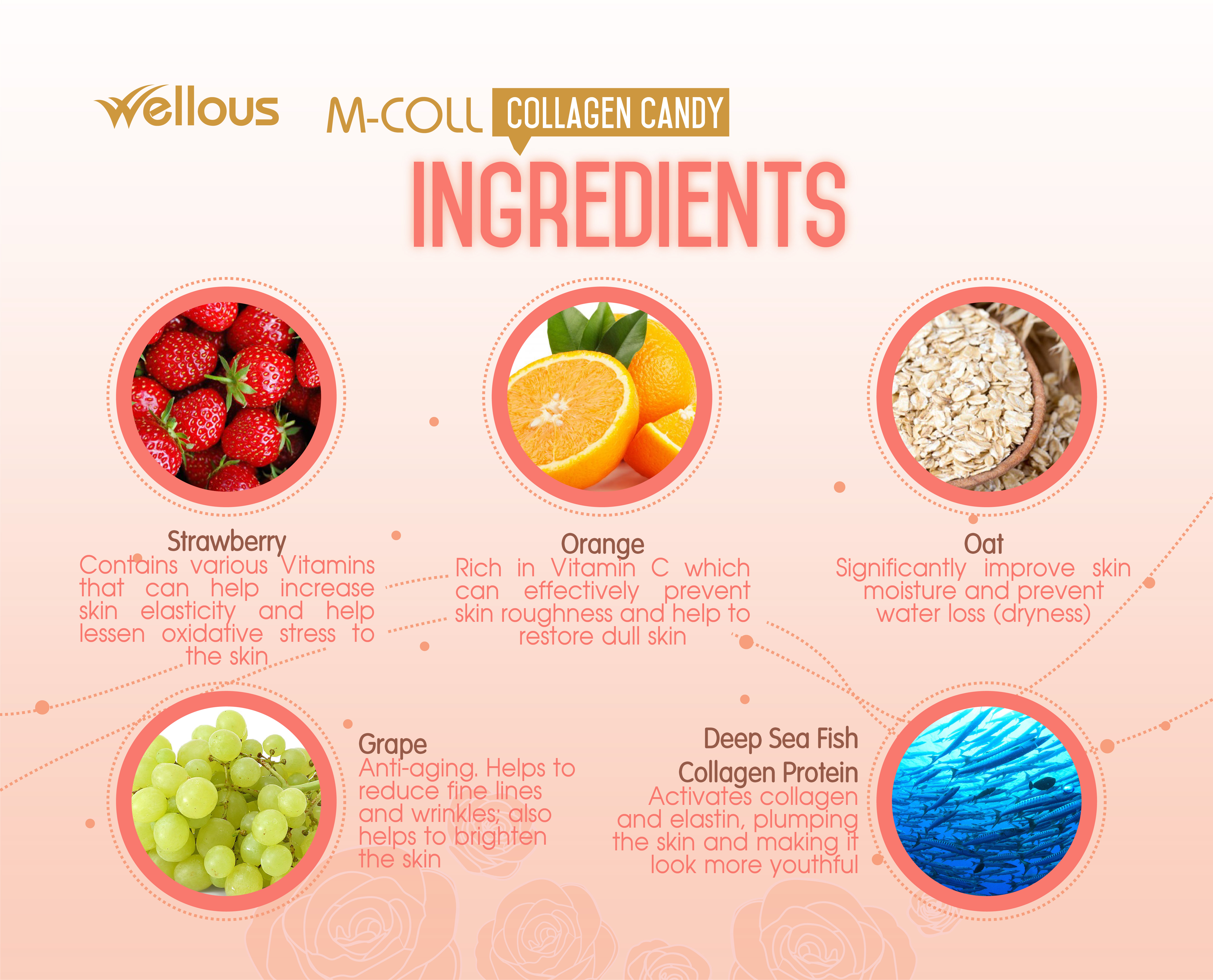 Fish collagen, strawberry powder, grape powder, orange powder, wheat flakes, maltodextrin, microcrystalline cellulose, sucralose, magnesium stearate, silicon dioxide