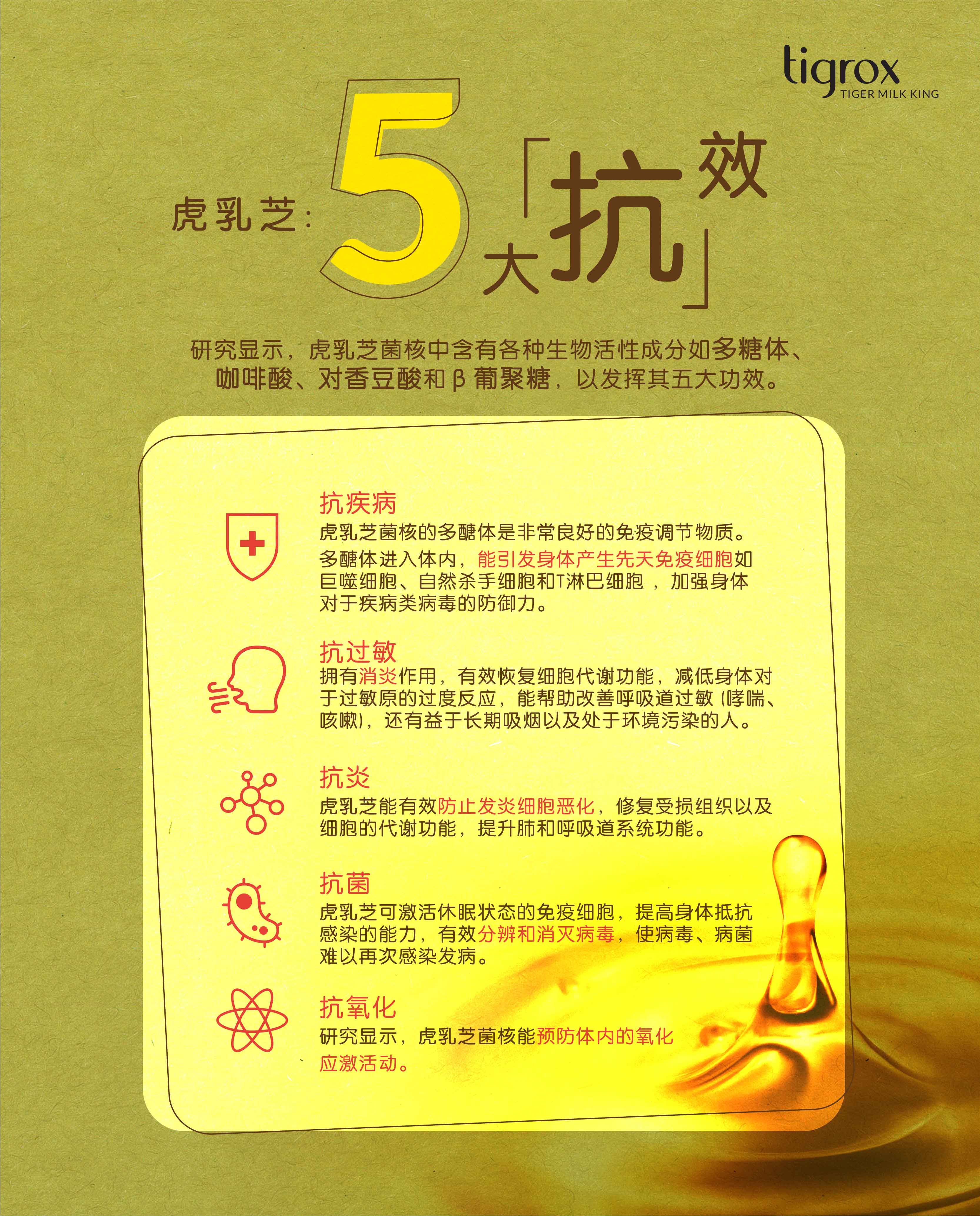 Tigrox Tiger Milk King 虎乳芝一种可以帮助您保持肺部健康的营养补充剂,以虎乳芝为主要成分的保健配方。 我们的肺部是至关重要的重要器官之一。